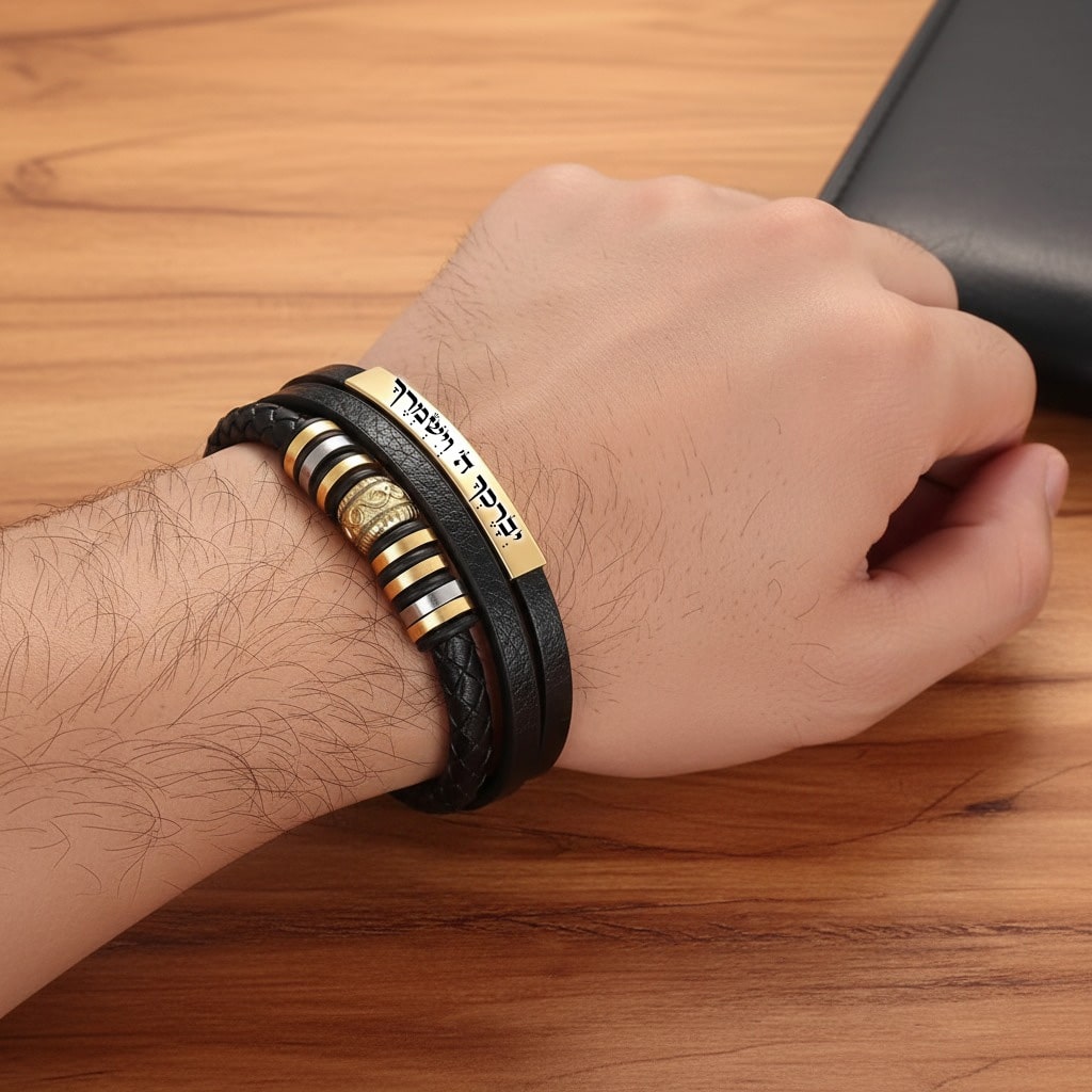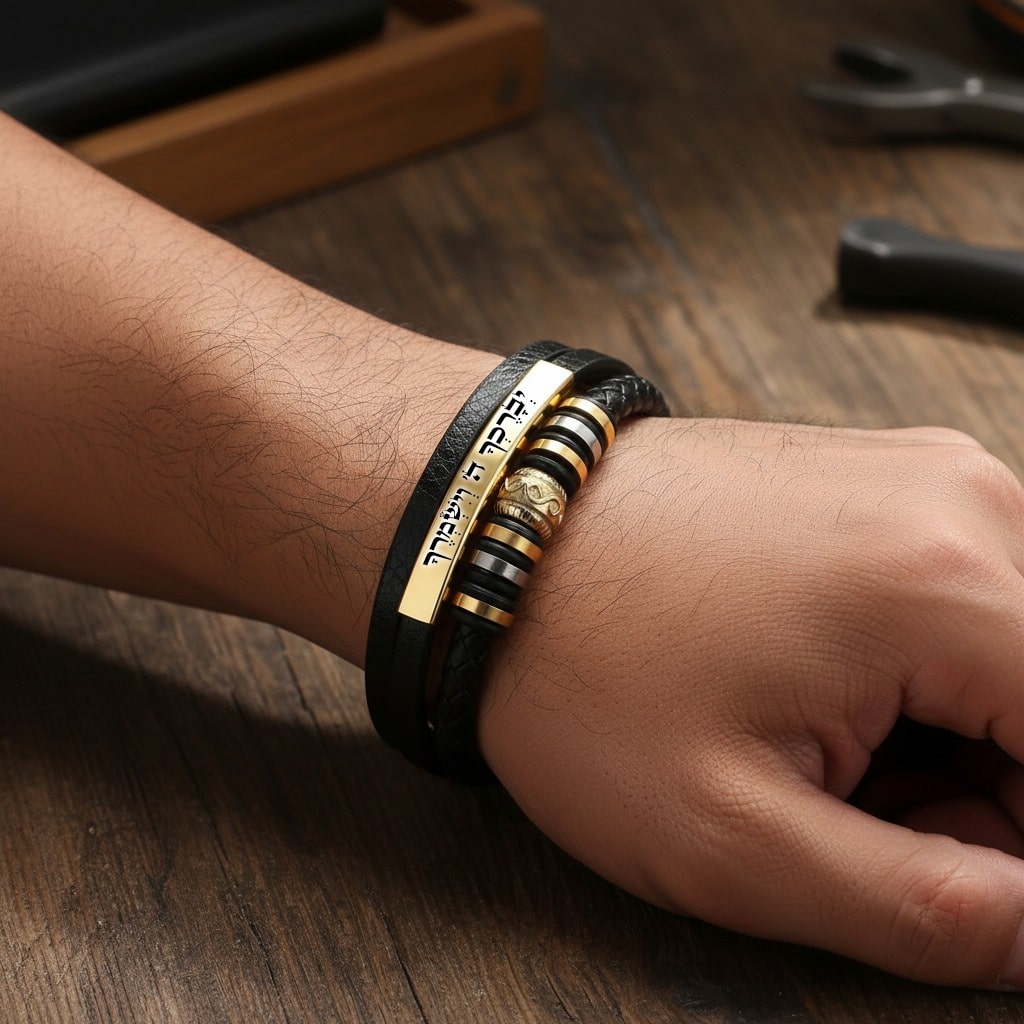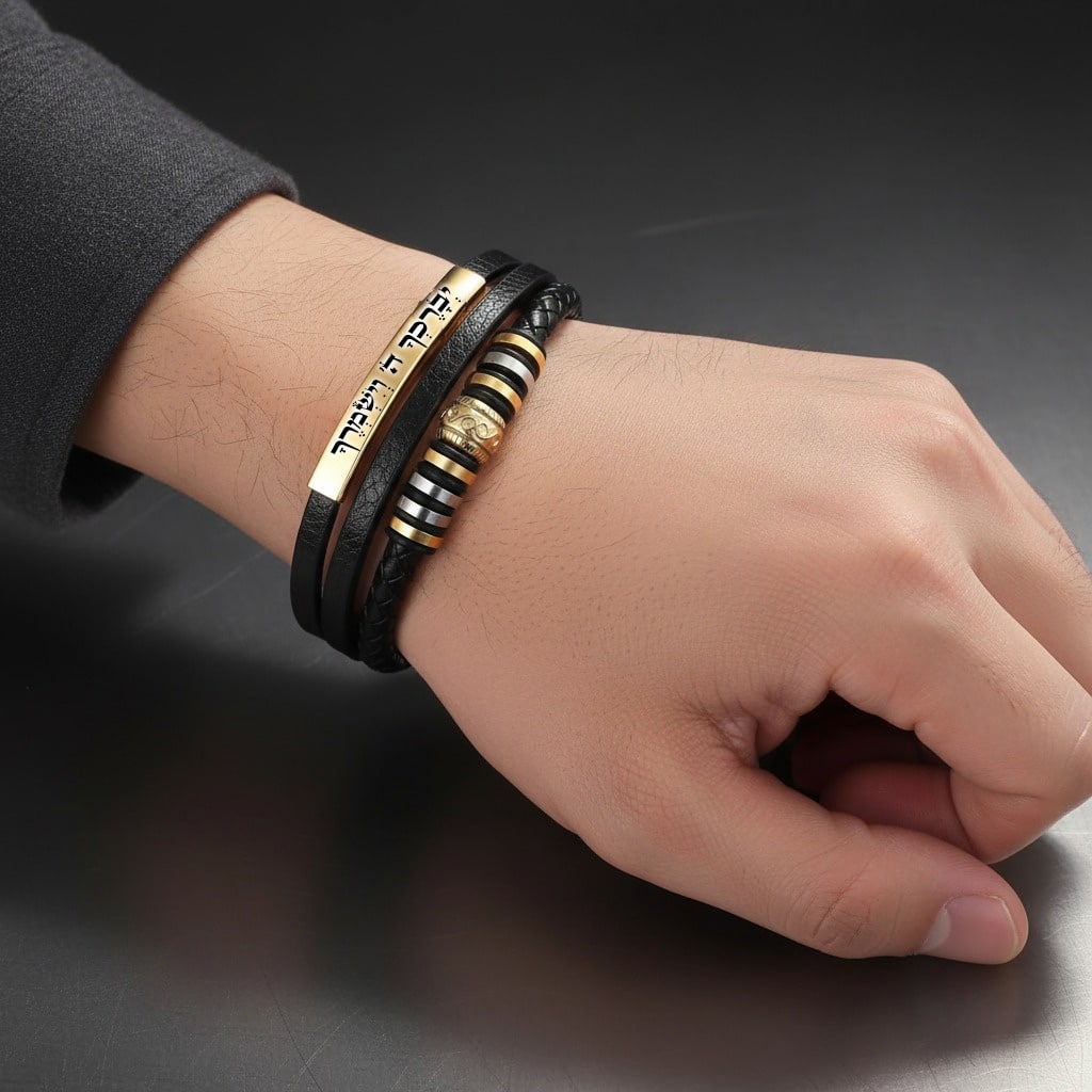 צמיד עור אופנתי לגבר לוחית ציפוי זהב אל חלד מהממם כולל צריבה אישית בלייזר, ניתן לצרוב בכל שפה ומה שרוצים