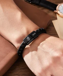 הצמיד עשוי מעור וכולל לוחיות לצריבה עם ציפוי טיטניום לבחירה בשני צבעים שחור/כסוף. ניתן גם להוסיף צריבה אישית על גבי האבזם.