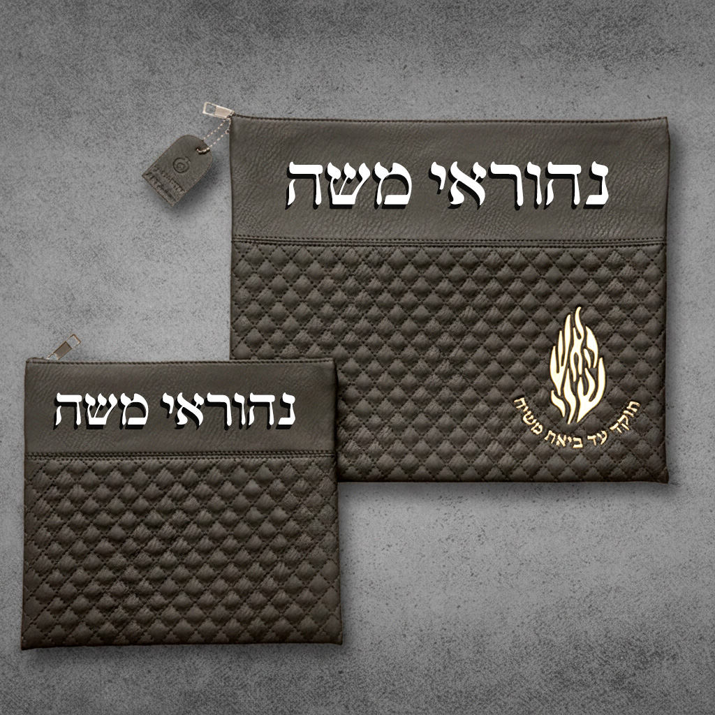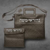 סט מהודר של כיסוי טלית ותיק לתפילין עם רקמה אישית של שם, המשלב בין מסורת יהודית עתיקה לבין עיצוב מודרני ואלגנטי.