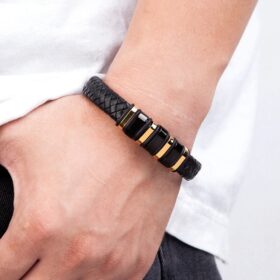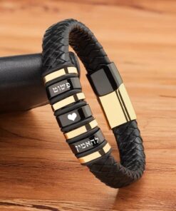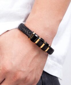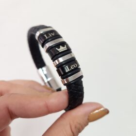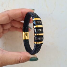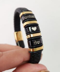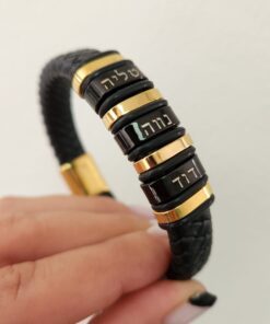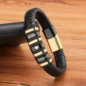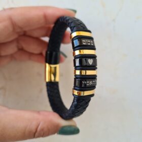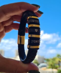 צמיד לגבר קוטר 21 סמ (סטנדרטי לגבר) עשוי מעור כולל לוחיות טיטניום ציפוי כסף/זהב עם צריבה אישית בלייזר