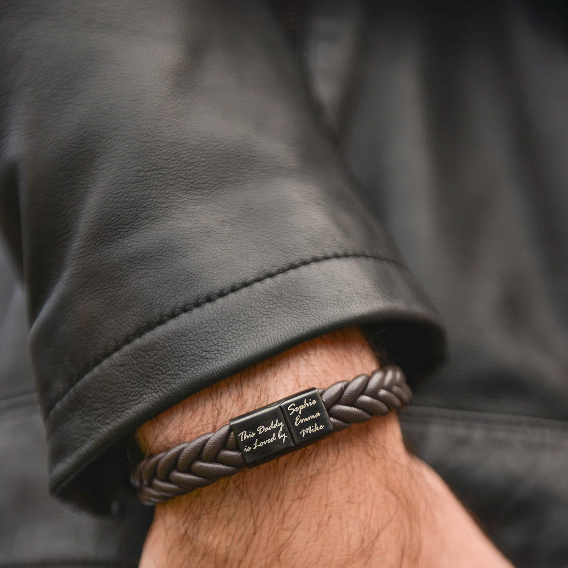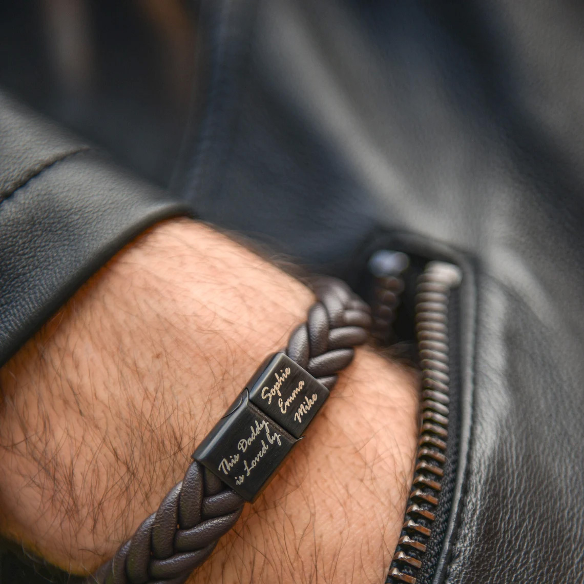 צמיד עור אופנתי לגבר לוחית כסף אל חלד מהממם כולל צריבה אישית בלייזר, ניתן לצרוב בכל שפה ומה שרוצים